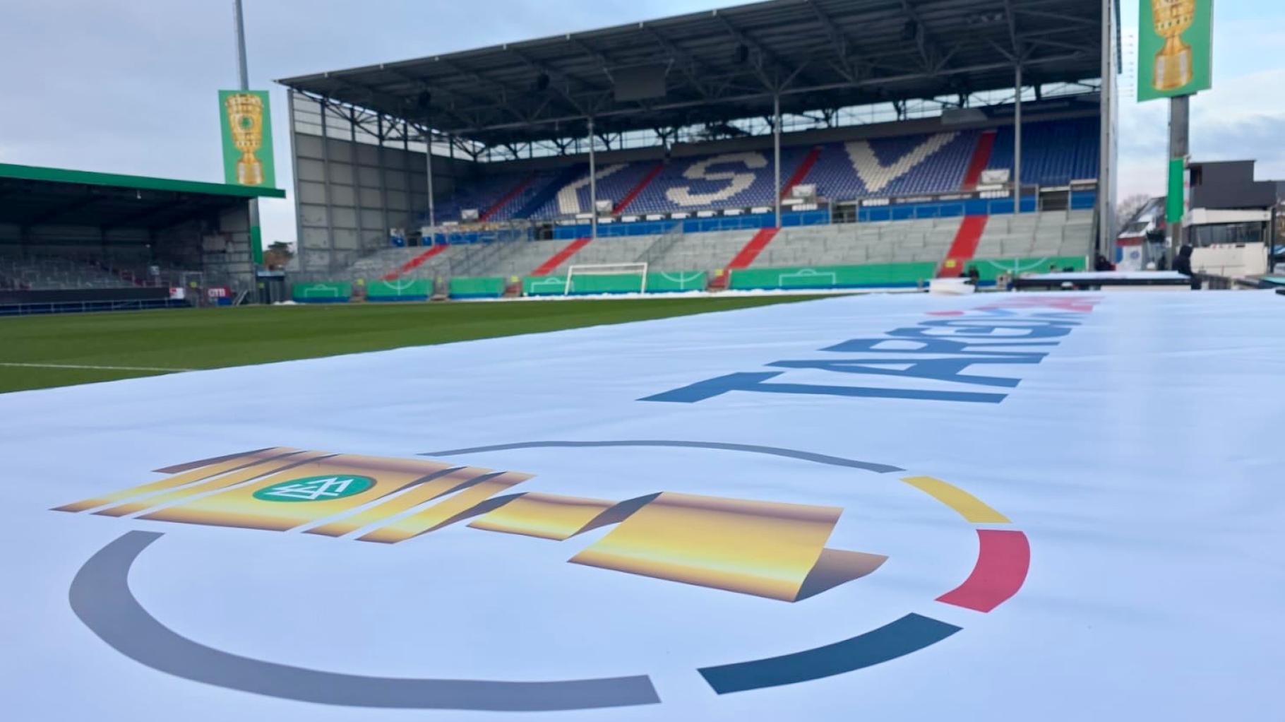 Mit Pokal- und Sponsorenlogos: Das Holstein-Stadion wird für das Duell am 4. Februar zwischen Kiel und Titelverteidiger VfB Stuttgart im DFB-Pokal-Viertelfinale herausgeputzt.