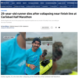 Die letzten drei Todesfälle hier in unserer Serie (gleich darunter) befassen sich mit dem tragischen Ableben von zwei Amateur-Marothonläuferm im Januar und einer Profiläuferin vor vier Monaten. Erwähnenswert ist, dass im Falle des Carlsbad-Halbmarathons gleich ein Dutzend Läufer hospitalisiert werden mußten. Sieh unsere Berichte gleich hier darunter.