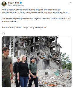 „Nachdem ich drei Jahre lang als Botschafterin in der Ukraine unter Putins Raketen und Drohnen gearbeitet hatte, trat ich zurück, während Trump weiterhin Putin beschwichtigte.